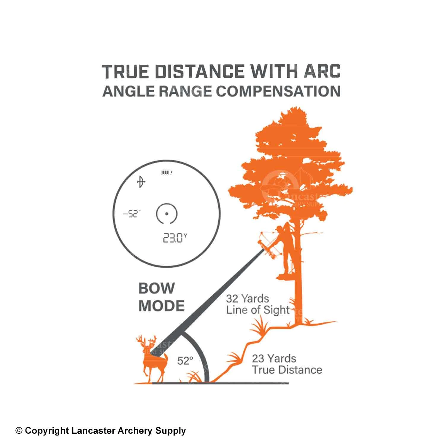 - ARC (Angle Range Compensation) accounts for terrain angle, giving you true distance to targets on uphill and downhill shots