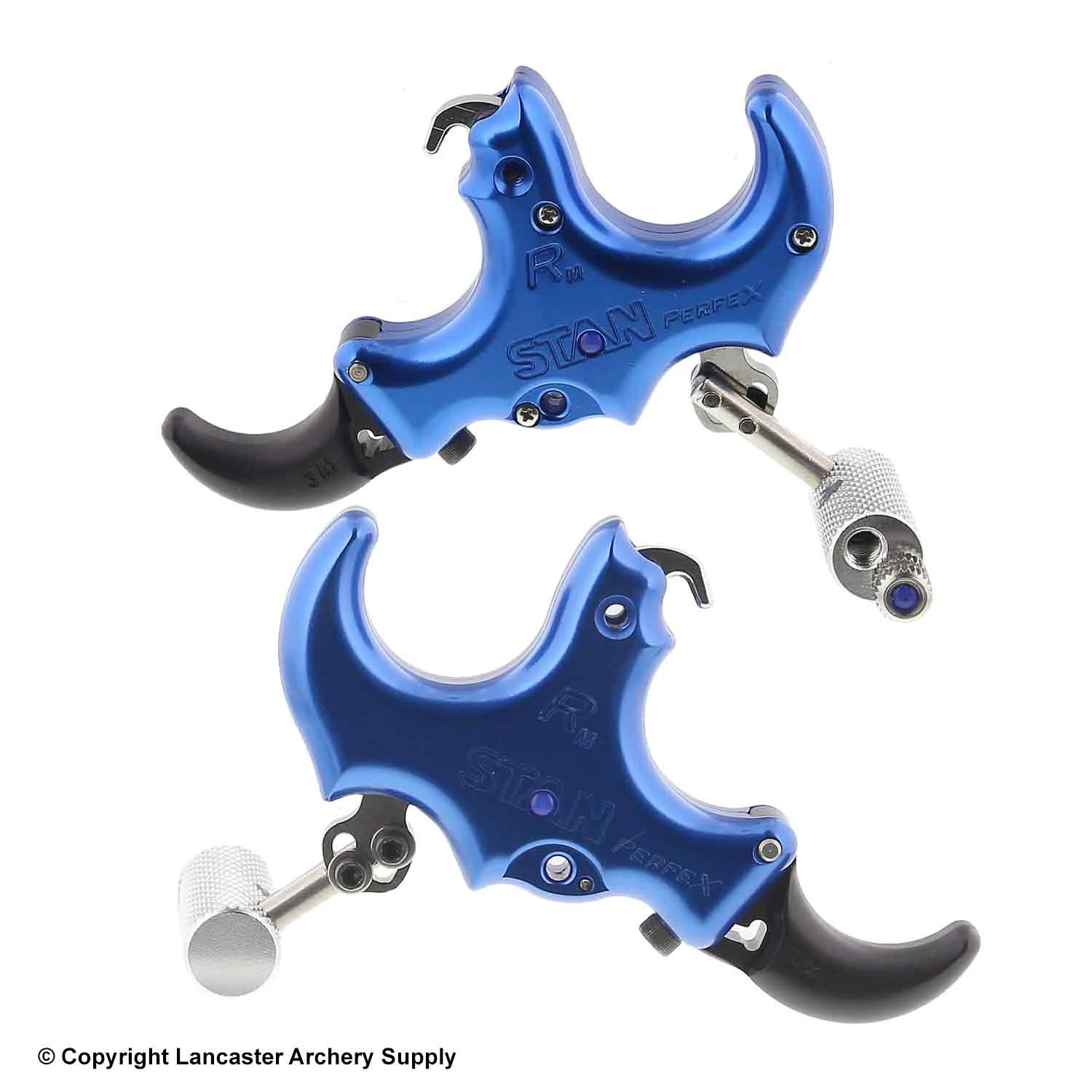 | • PerfeX Resistance activated short neck release aid • Finish is blue bright dip-anodized aluminum core with matte finish black anodized aluminum finger extensions Includes: • Interchangeable 3 & 4 finger extensions (assembled as a 4 finger) • 3 trigger post lengths – 7/8″, 1″, 1-1/8″ (assembled with 1″ post) • 1 Large and 1 small knob (assembled with small knob) • Trainer Lock pin |